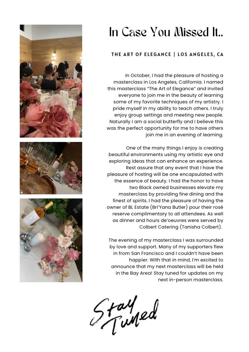 After the incredible success of my first class, I'm so excited to welcome you to the second The Art of Elegance, a luxe, hands-on experience designed for beauty lovers, creatives, and aspiring makeup artists ready to level up.